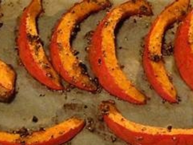 1) A megtisztított szeletekre vágott hokkaido tököt 200 fokon sütjük 25-30 percig