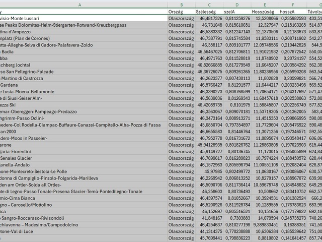 Európában, földrajzi adottságainak köszönhetően, számos síelésre alkalmas hely található. Egy táblázatban rendelkezésre állnak az európai síparadicsomok adatai. Feladata ezeknek az adatoknak a feldolgozása táblázatkezelő program felhasználásával.