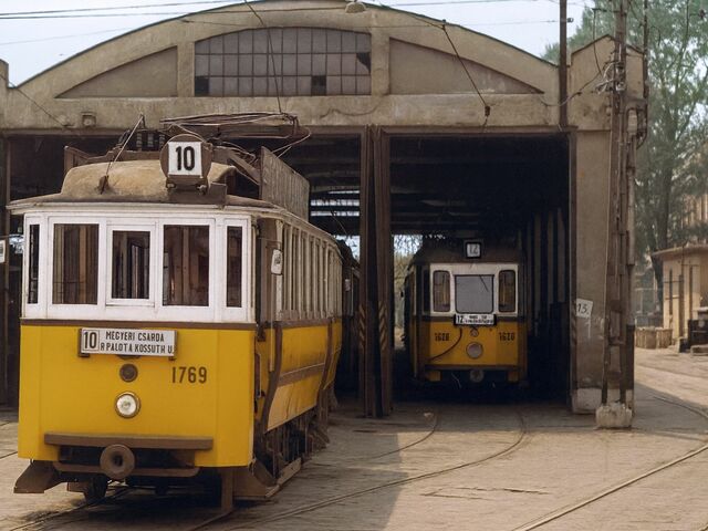 1524 pályaszámú acélvázasított '1500-as' motorkocsi pótkocsijával (takarásban) a Baross tér - Keleti Pályaudvari hurokvégállomáson a 67-es viszonylaton - 1979-es, eredetileg fekete-fehér fotó színezett, újraalkotott változata.