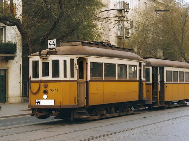 2841 pályaszámú favázas, nyitott peronos motorkocsi acélvázasított pótkocsijával a Thököly úton a 44-es viszonylaton - 1969-es, eredetileg fekete-fehér fotó színezett, újraalkotott változata.